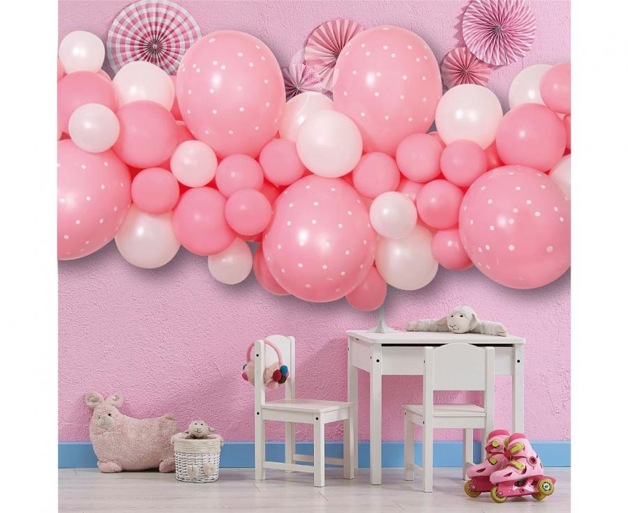 Girlanda iz balonov za deklice vključuje 65 balonov in trak za zlaganje. Dimenzije končane girlande so 200x50x70 cm, vse v nežno roza barvi, idealno za praznovanja.