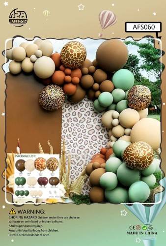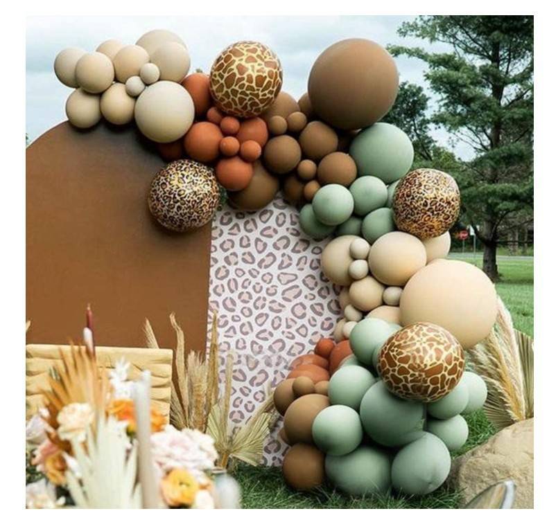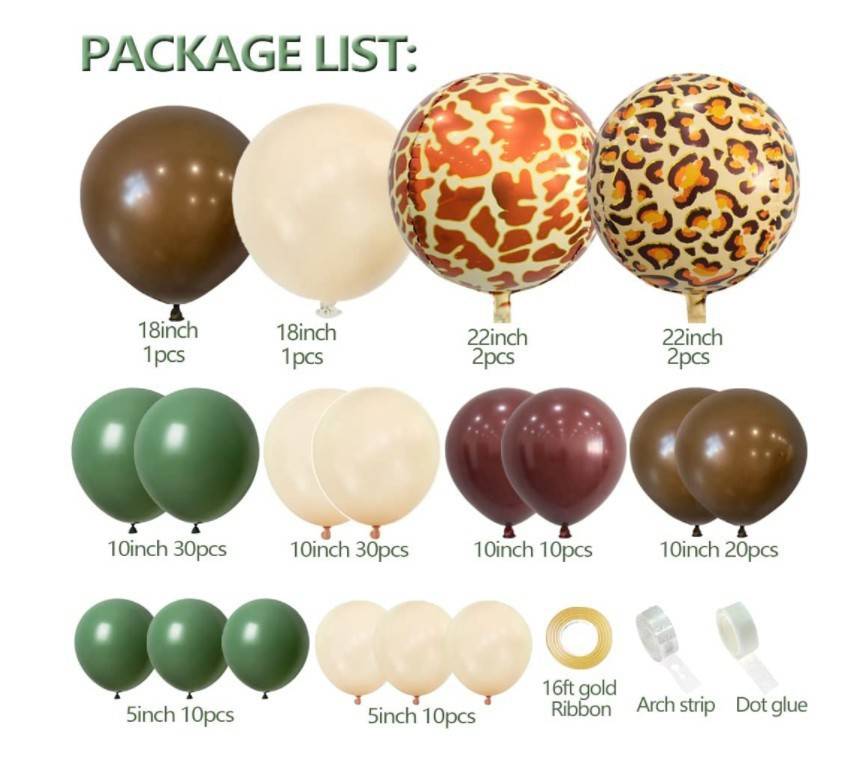 Komplet safari girlande s 78 baloni, vključno z folijskimi baloni z živalskimi motivi (opica, zebra, lev) in mešanico zelenih, belih in sivih balonov. Lepilne pike in trak olajšajo sestavljanje – okrasek ostane napihnjen več dni!