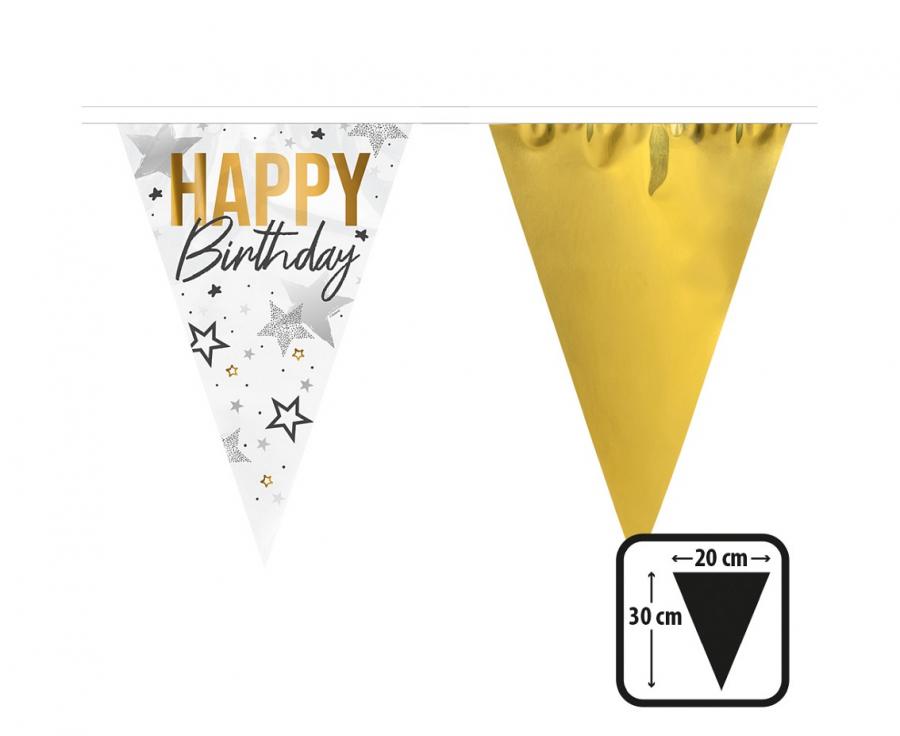 Girlanda iz folije z zastavico Happy Birthday, dolžine 6 ms, z elementi velikosti 30x20 cm v beli in zlati barvi, zagotavlja elegantno in impresivno dekoracijo rojstnodnevnega praznovanja.