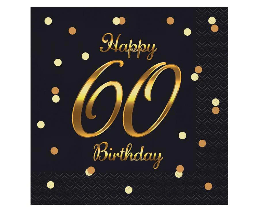 Črno-zlati prtički z napisom Happy 60 Birthday podarijo vašemu praznovanju eleganten in prazničen videz. Dimenzije 33×33 cm. V paketu je 20 kosov.