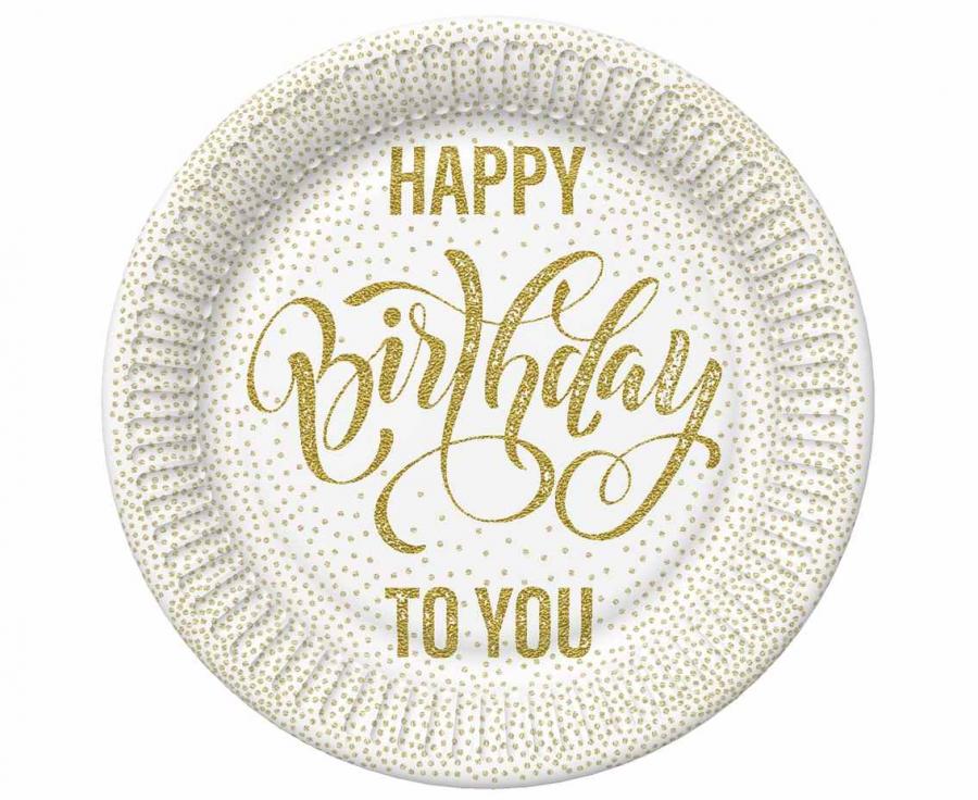 Okrogli papirnati krožniki s premerom 23 cm z napisom Happy Birthday in zlatim vzorcem pik. Paket vsebuje 8 kosov, idealnih za elegantne rojstnodnevne zabave.