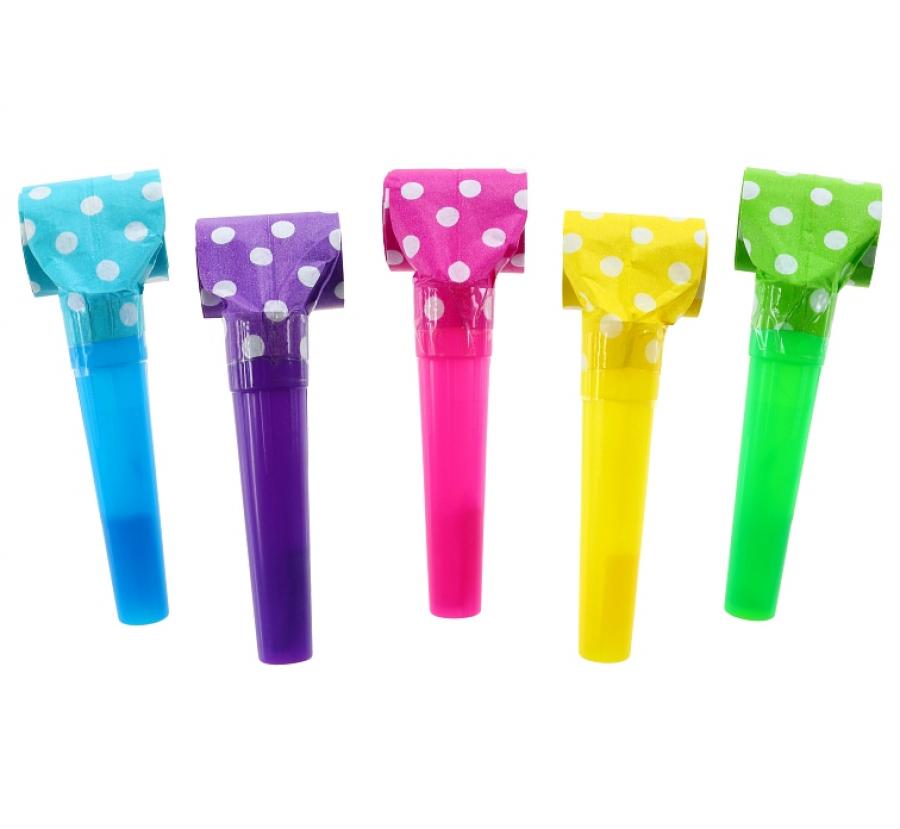 Barvite trobente za zabave z belimi pikami so na voljo v kompletu po 5 kosov. Izdelane so iz papirja in plastike, vsaka pa ima praktičen plastični ustnik za varno in zabavno uporabo.