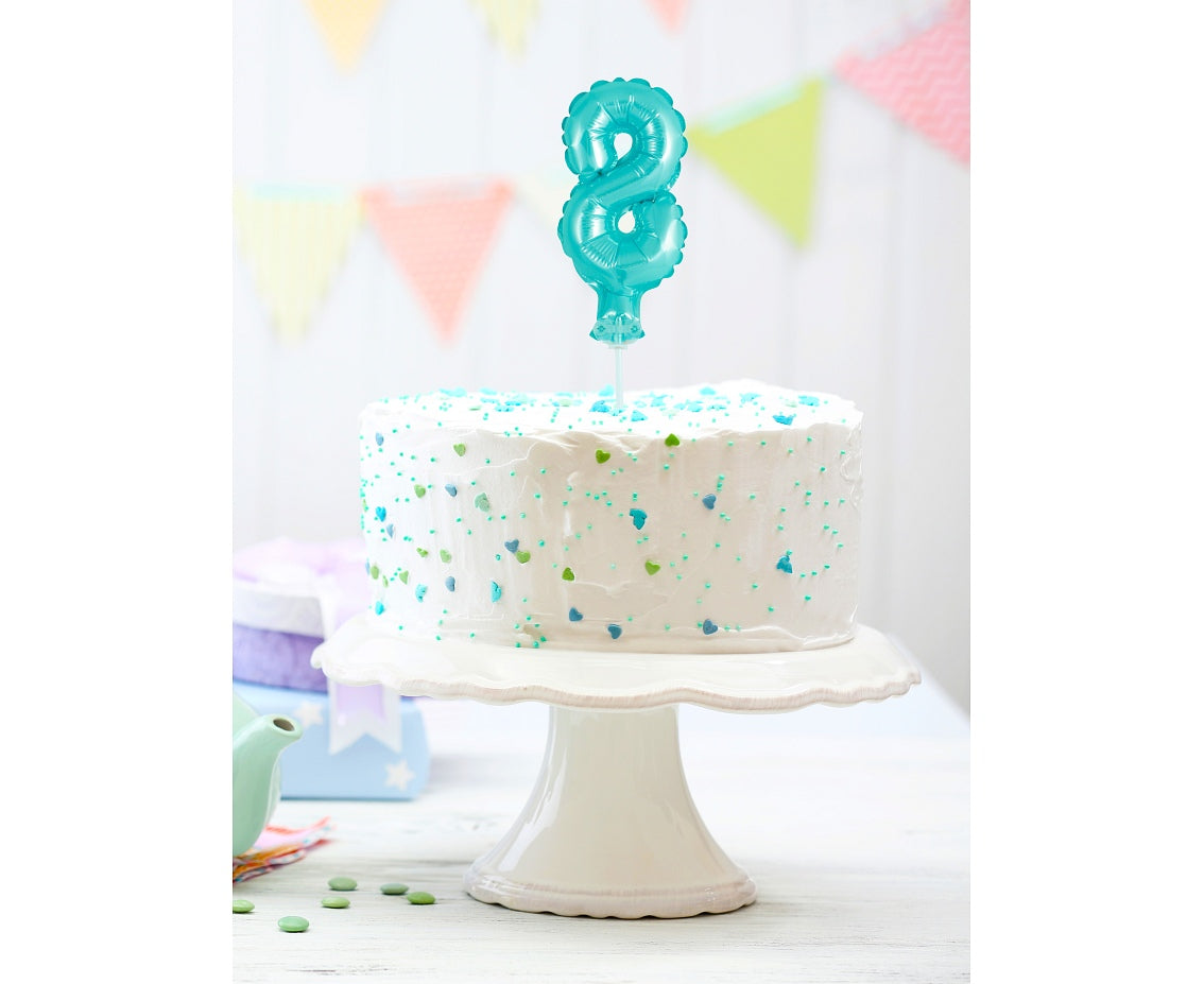 Mini folijski balon v obliki številke 8, popoln kot okras za torto ali sladico. Napihnjen je z zrakom in je nameščen na praktični palčki za enostavno namestitev v aranžmaje.