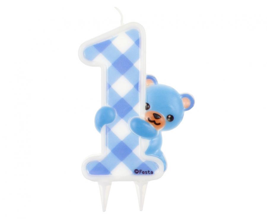 Rojstnodnevna sveča številka 1 z velikim modrim medvedom
