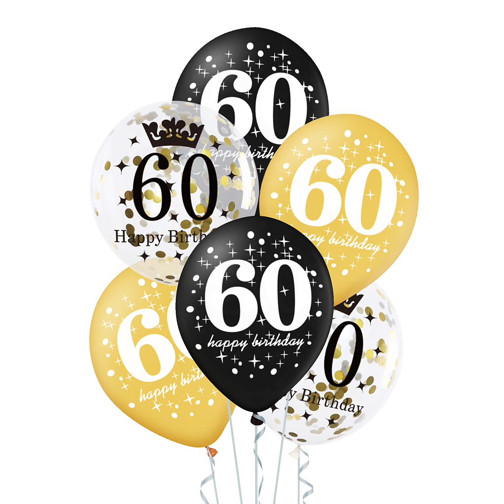 Komplet 6 balonov za 60. rojstni dan: 2 črna s potiskom, 2 zlata s potiskom in 2 prozorna s konfeti. V originalni embalaži, certifikat CE. Primerno za polnjenje s helijem ali zrakom, idealno za hitro in usklajeno dekoracijo prostora.