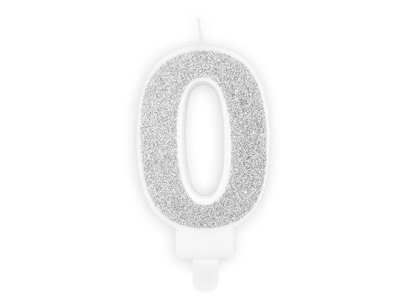 Srebrna rojstnodnevna sveča številka 0 z bleščicami 7 cm